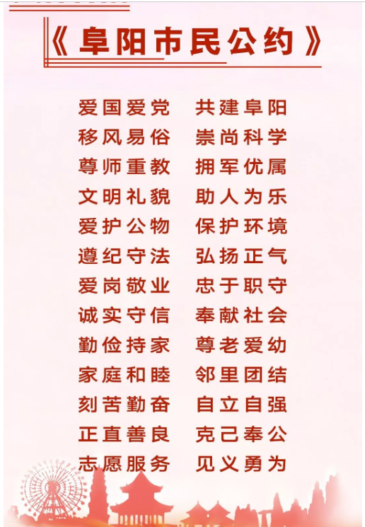 新版《阜阳市民公约》以社会主义核心价值观公民个人层面的价值准则为基础,以公民基本道德规范为依据,涵盖了社会公德、职业道德、家庭美德、个人品德等内容,内涵丰富、特色鲜明,响应了市民呼声,顺应